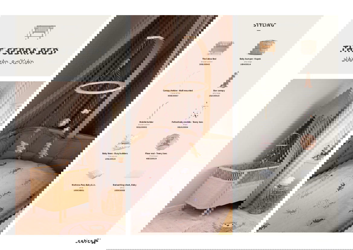 The Sebra wooden mobile holder is easy to mount and fasten between the bars of the Sebra Bed, Baby & Jr. or another cot, cradle, changing unit or playpen with bars. The holder is easily mounted on the bed by screwing the two padded discs together using the rotary piece.
