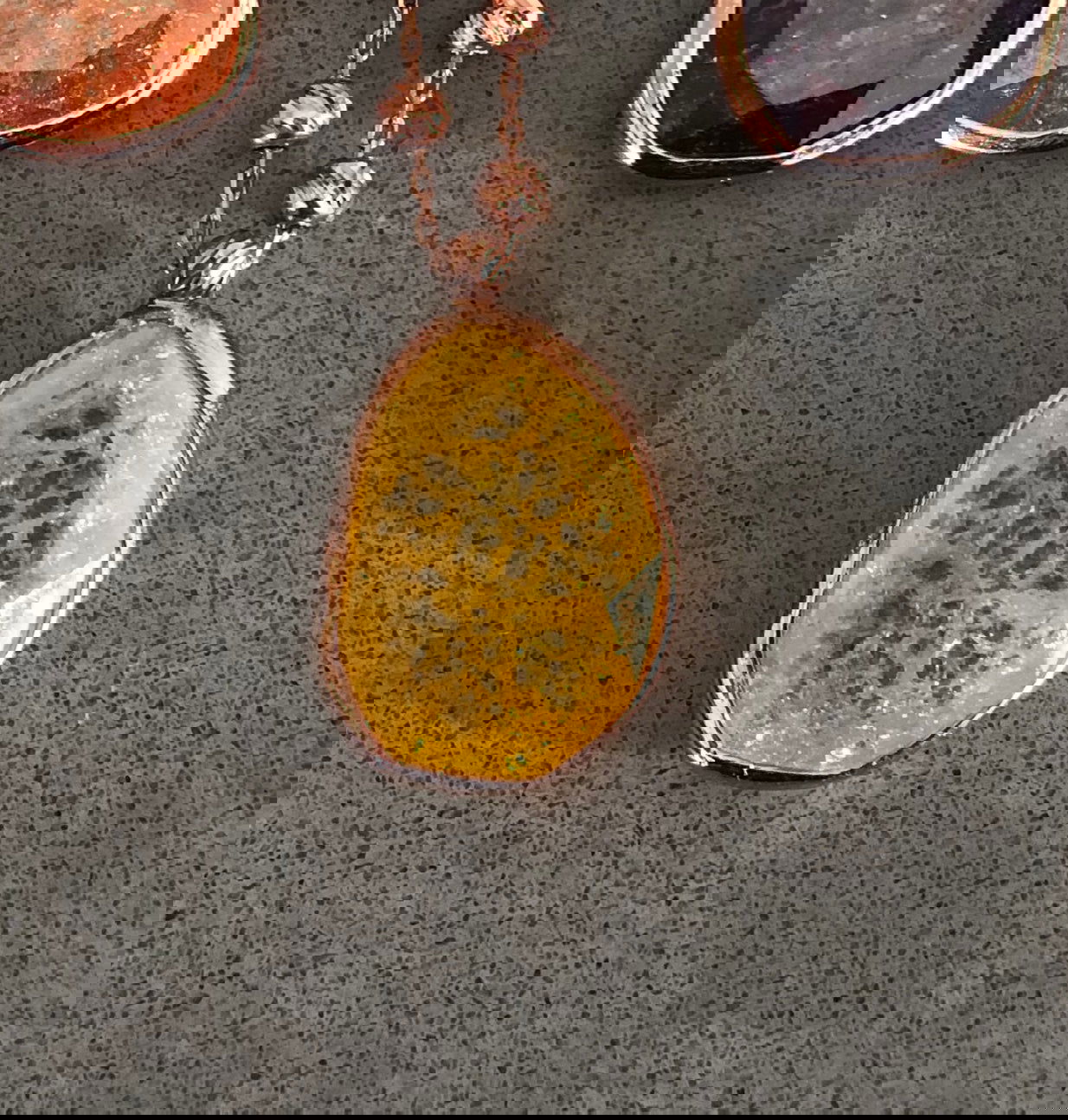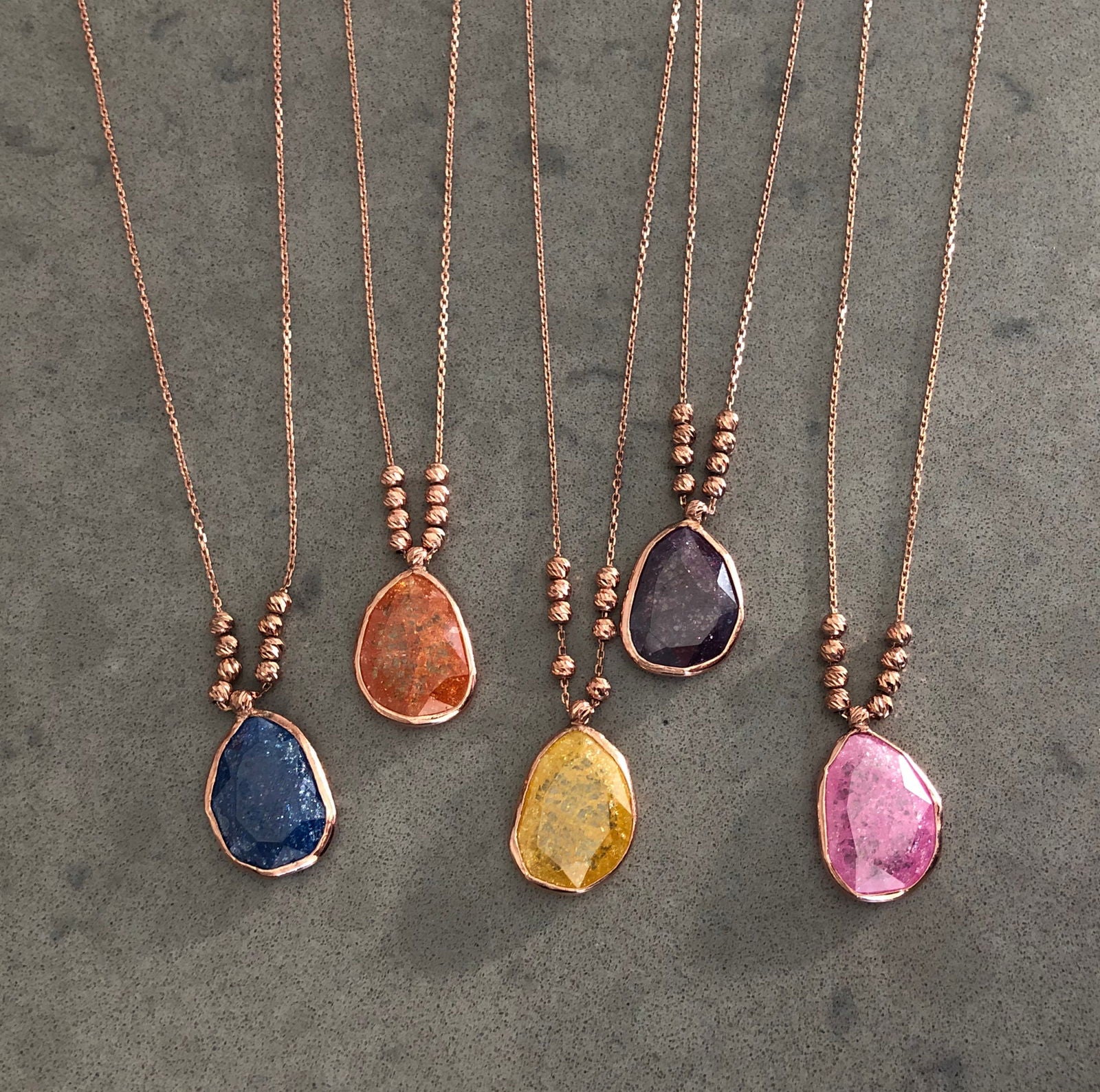 /|Uniquely shaped stones, available in 5 vibrant hues: pink, orange, blue, purple, and yellow. Every piece is one-of-a-kind with a rose gold plated silver chain and casing.