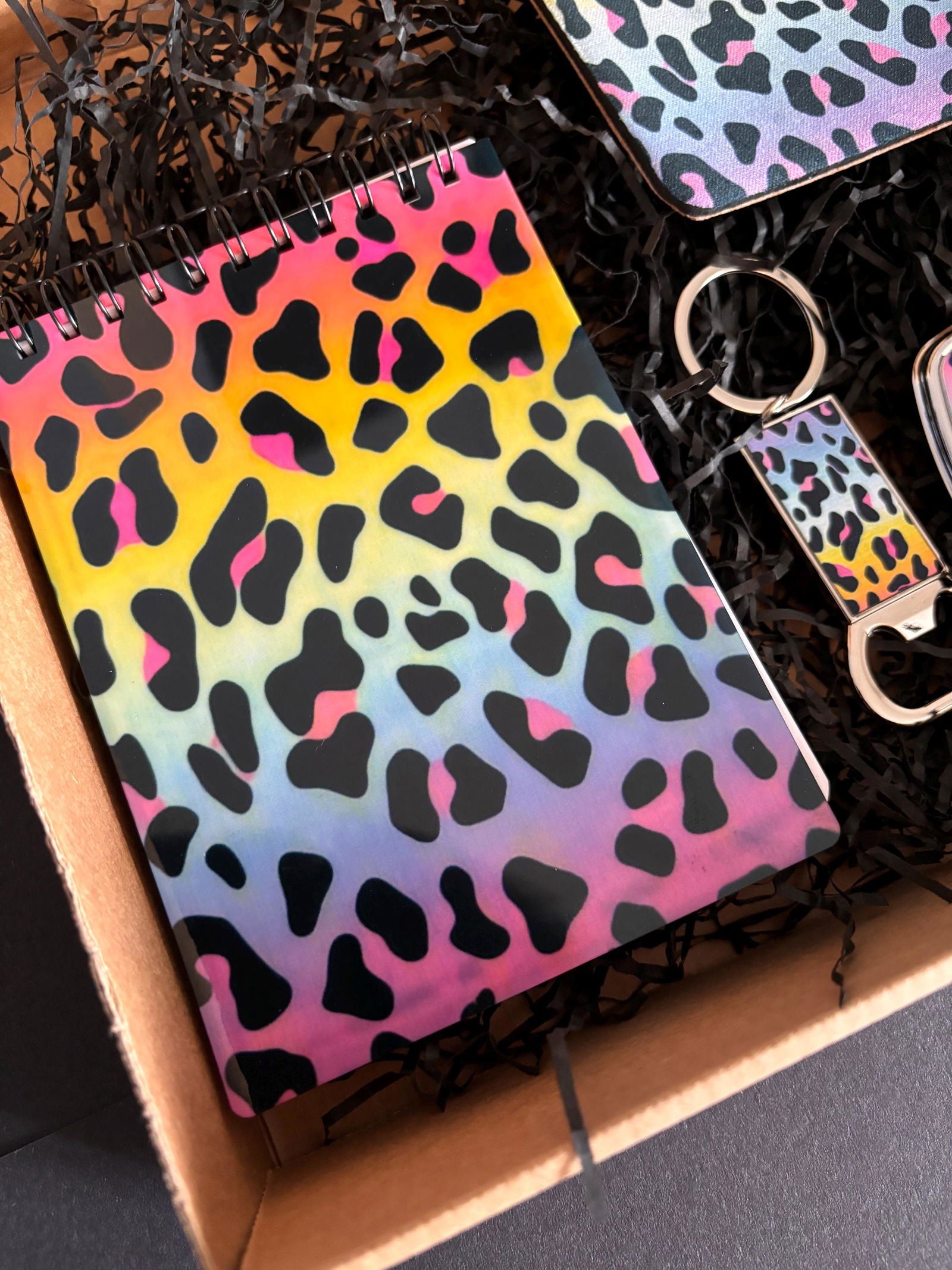Bright and Colourful Leopard Print Gift Set, Bottle Opener Keyring, Coaster, Compact Mirror, & Notepad Practical Gift Set, Birthday Gift Box