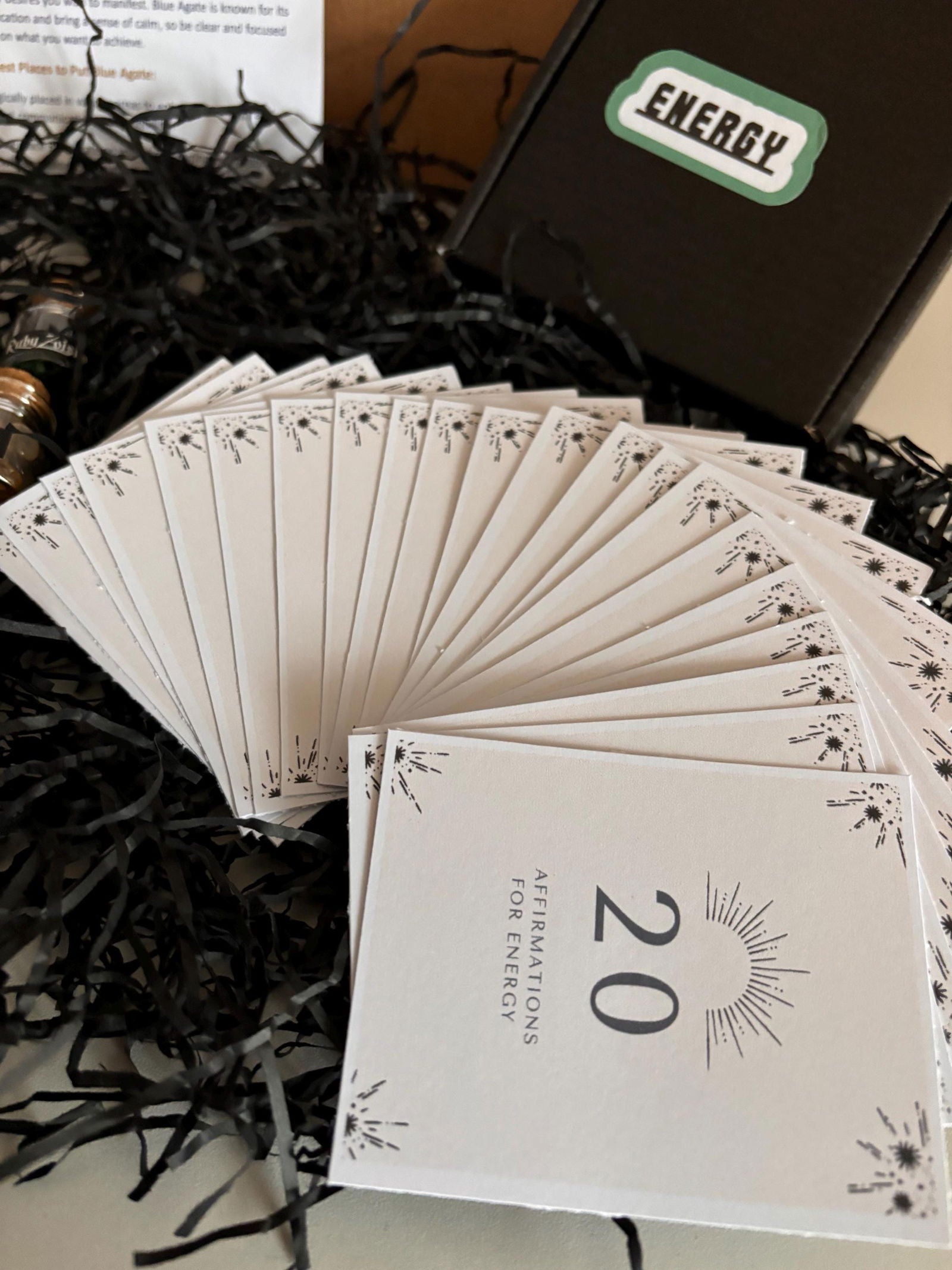 Choice of Crystals: Select from energising crystals like White Agate, Labradorite, Blue Agate and Ruby Zoisite, each known for their ability to enhance motivation, creativity, and focus. Beginner’s Guide: A user-friendly guide on how to use your chosen crystals to harness their energetic properties, perfect for both beginners and seasoned crystal lovers. 20 Energy Affirmation Cards: Beautifully designed affirmations to inspire positive thinking, boost motivation, and increase your energy levels. Use them daily to stay focused and energized. ⚡ Why Choose This Energy Gift Set? This set is perfect for anyone looking to boost their energy levels, stay motivated, and maintain a positive mindset. Whether you’re starting a new project, working through challenges, or just need a daily energy boost, these crystals and affirmations will help keep your energy high and positive.