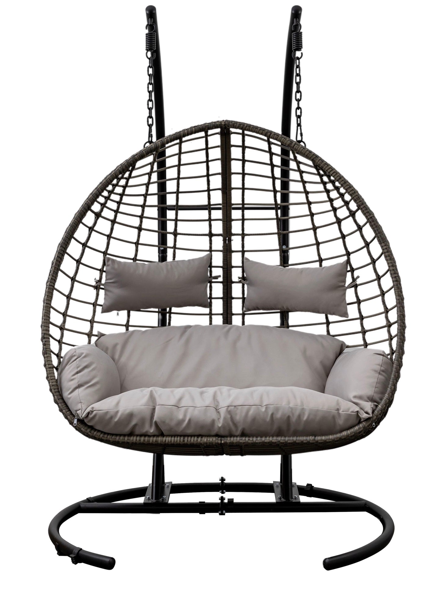 Relax in style in this incredibly comfortable hanging chair. Crafted from rattan with luxuriously deep showerproof cushions, it is perfect for balconies, patios and poolside spaces, and even looks great indoors. The frame, which can be dis-assembled for easier storage over winter, is power coated steel. A 2-seater version is also available.