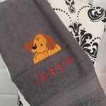 Bring a little bit of puppy love into your home with these personalised flannel, hand, and bath towels! Add your name or a warm sentiment, and know that puppy love is in every single stitch.