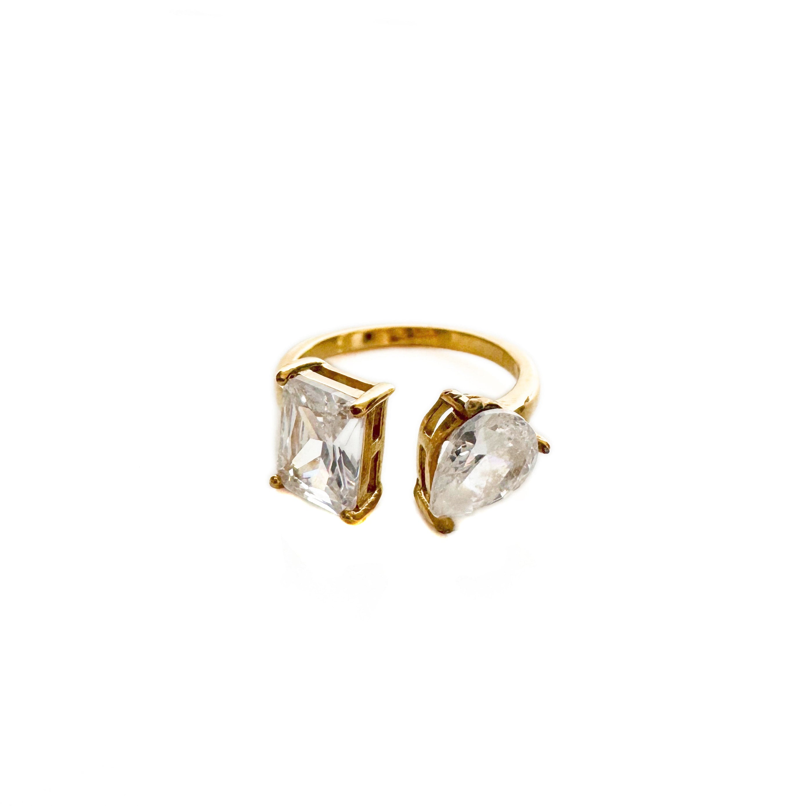 Modern elegance meets timeless allure in the Lanie Luxe 18K Gold Plated Asymmetric Jewel Ring. This statement piece features two contrasting cuts, a radiant rectangular stone and a teardrop crystal set on an open gold-plated band that celebrates individuality and refined style.