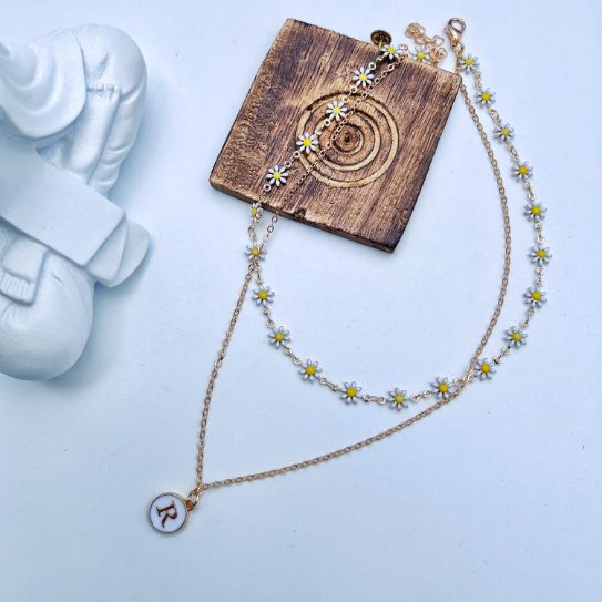 Personalised Initial White Sun Flower Charm Two Layer Pendant Choker Necklace