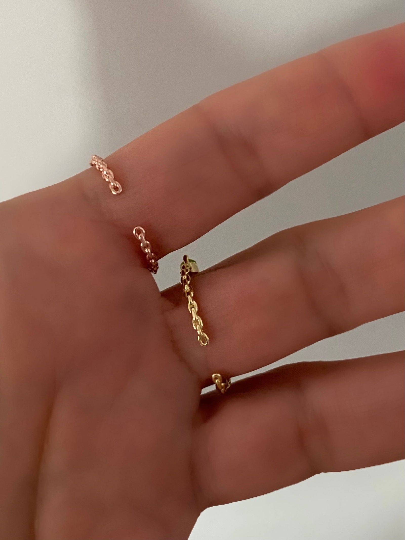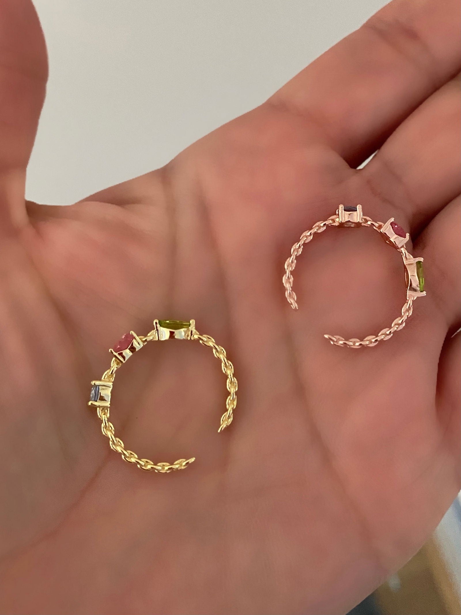 link chain design ring with three zircon sones, Pink heart shaped, blue round and green oval.