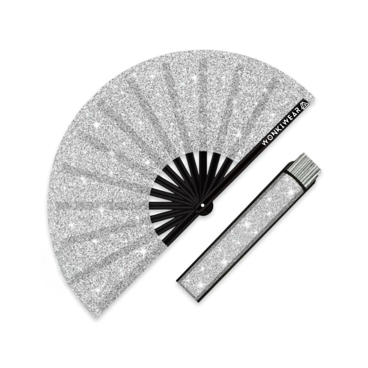 XL Festival Handheld Fan - Glitter, Sumptuous Silver with matching Leg Holster in