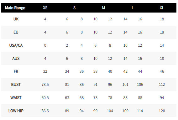 Size US UK EU AU China Japan Bust (in/cm) Waist (in/cm) Hips (in/cm)