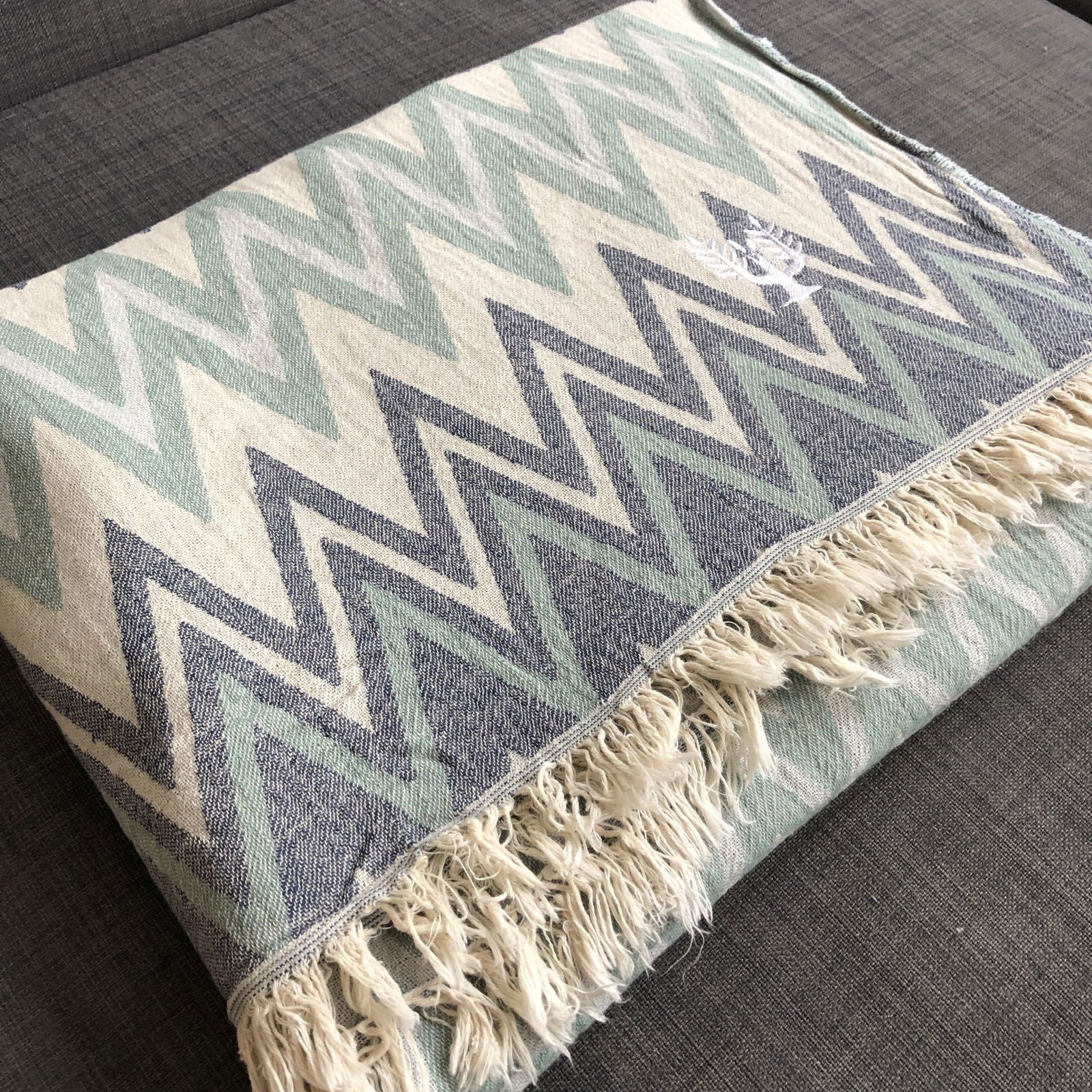This unique throw is woven in a sumptuous organic cotton in a jacquard weave. The throw is super soft making them a beautiful addition to the home. The unique design of bold zigzag patterns in a harmonising mix of muted greens, blues and greys is at once striking and subtle.