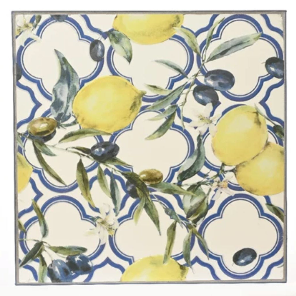 The Sorrento chair showcases its stunning Italian-inspired design featuring lemons, black olives, green leaves, and white flower blossoms. Complete the set with a matching Sorrento Mosaic Bistro Table.