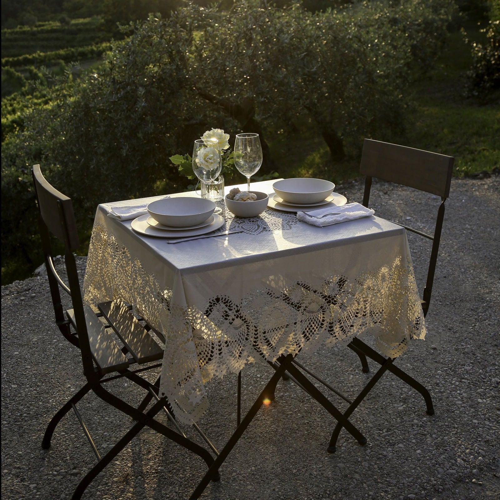 This beautiful bistro table size decorative tablecloth is suitable for indoor and outdoor use as it is made from fine laser-cut vinyl that will wipe clean.
