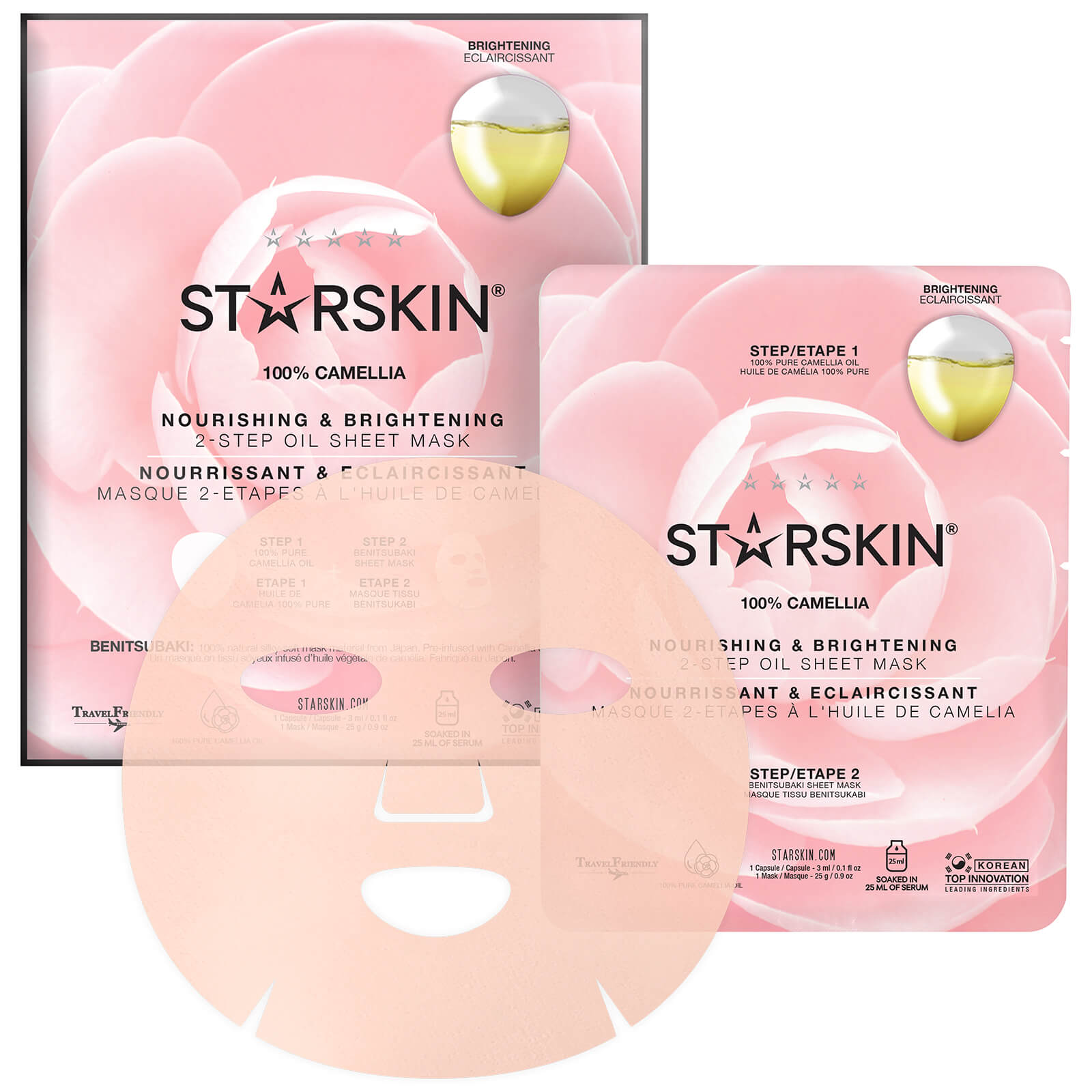 STARSKIN 100% Camellia 2-Step Oil Sheet Mask - Nourishing and Brightening. For hundreds of years, Camellia Seed Oil has been the beauty secret of the Geishas to reveal nourished and radiant skin. This unique and ultra-nourishing 2-step mask treatment combines 100% pure, cold-pressed Camellia Japonica Seed Oil with a 100% natural and silky-soft Benitsubaki sheet mask made from ultra-fine fibers and packed with radiance-boosting ingredients. Camellia Seed Oil is a premium beauty oil is high in fatty acids (particularly Oleic Acids), making it extremely compatible with our skin and thus quickly and easily absorbed without irritation.