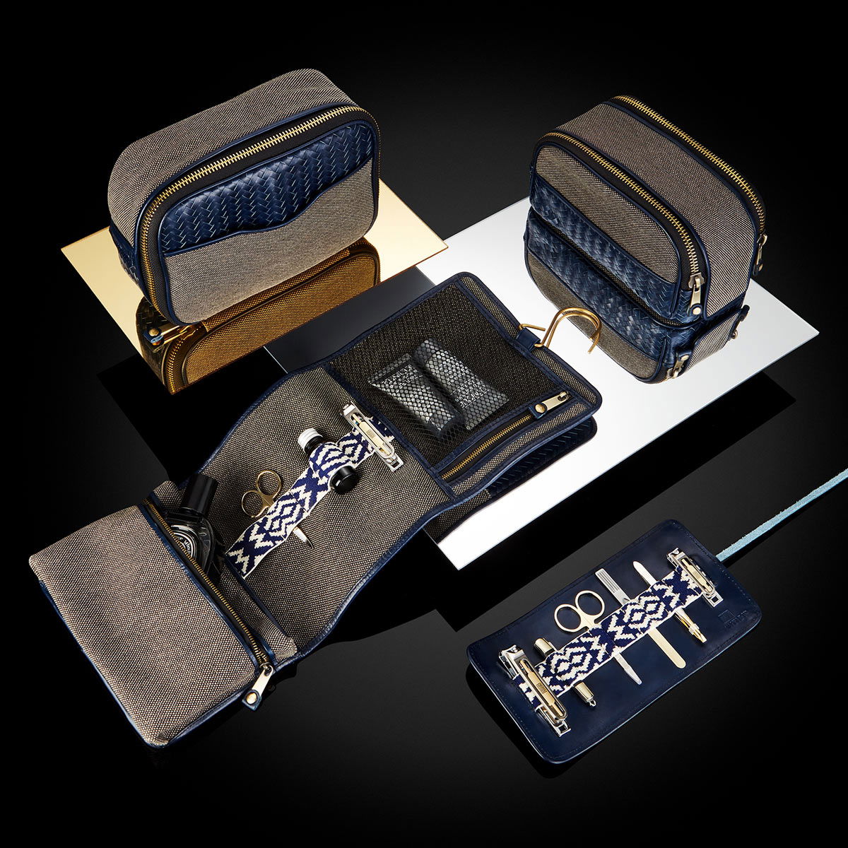 Herringbone Toiletry Wash Roll, Navy Blue