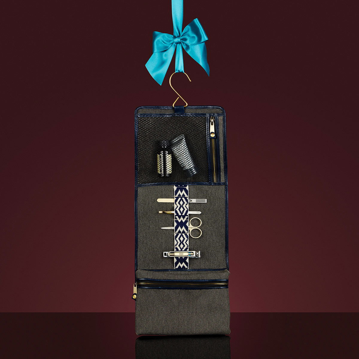 - Flip open hanging folding wash bag with a folding brass hook