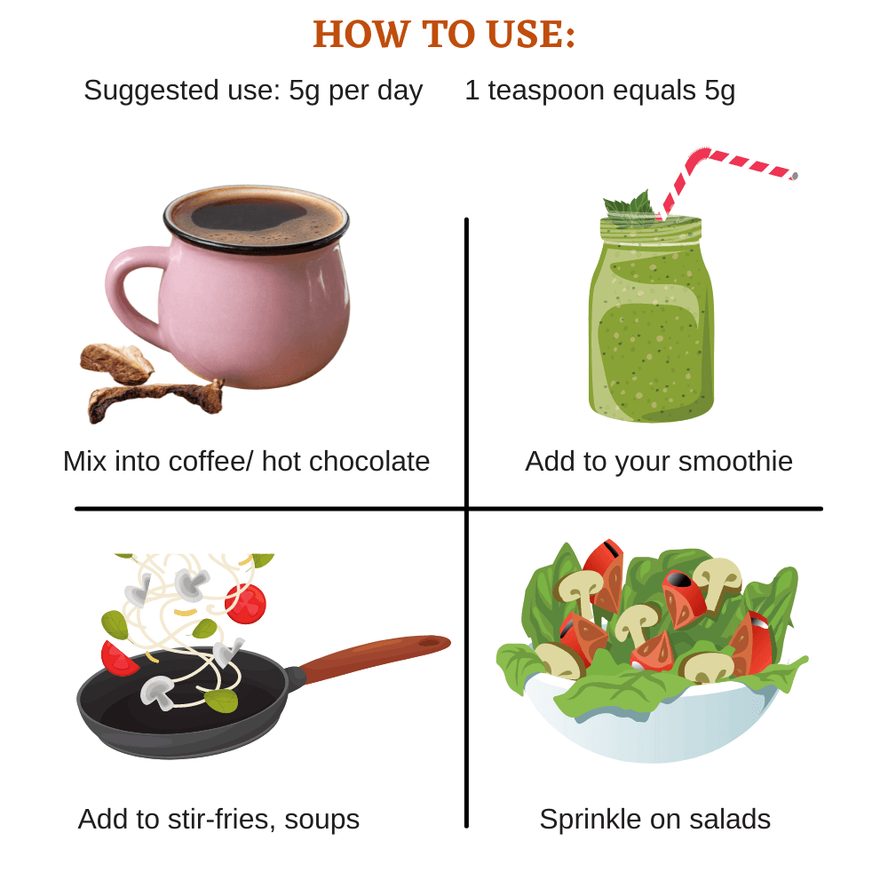 USE: Simply add 5g (1 teaspoon) of mushroom powder daily to your favourite hot drink (tea, coffee, hot chocolate), smoothies, salads, soups, stews, and pasta.