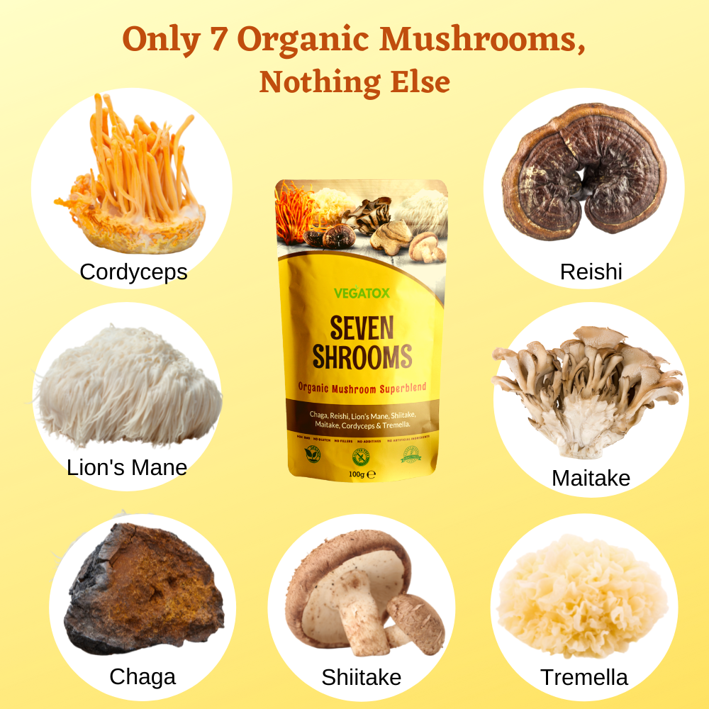 INGREDIENTS: Organic Chaga, Organic Reishi, Organic Lion's Mane, Organic Shiitake, Organic Maitake, Organic Cordyceps, Organic Tremella.