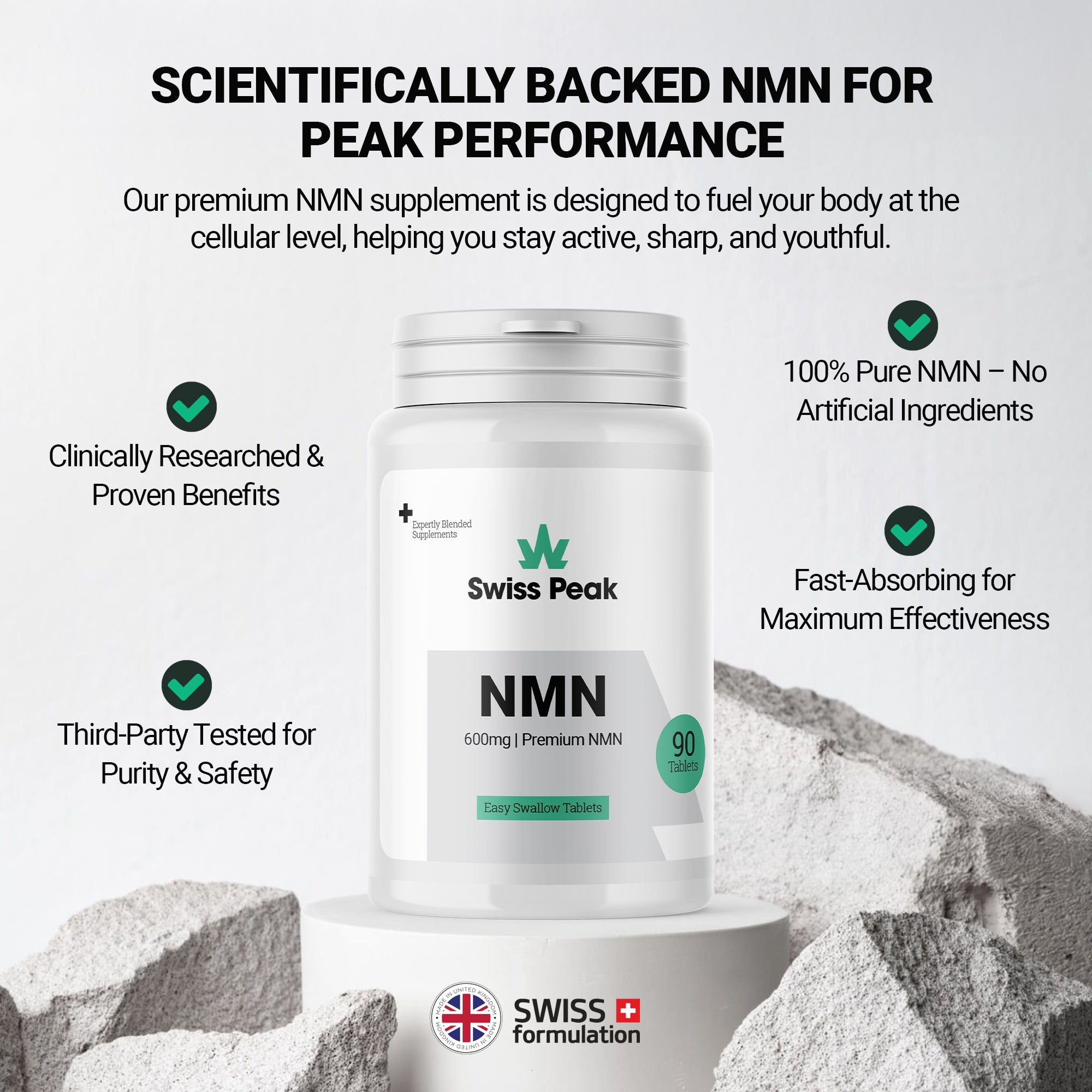 NAD+ is a crucial coenzyme that supports cellular energy, DNA repair, and longevity, but its levels decline with age, stress, and environmental factors. Our high-strength NAD+ formula delivers 600mg per serving (3 tablets) to help replenish and maintain optimal levels. By supporting mitochondrial function, NAD+ promotes sustained energy, cognitive performance, and overall wellbeing. This supplement is a convenient way to enhance your daily health routine.