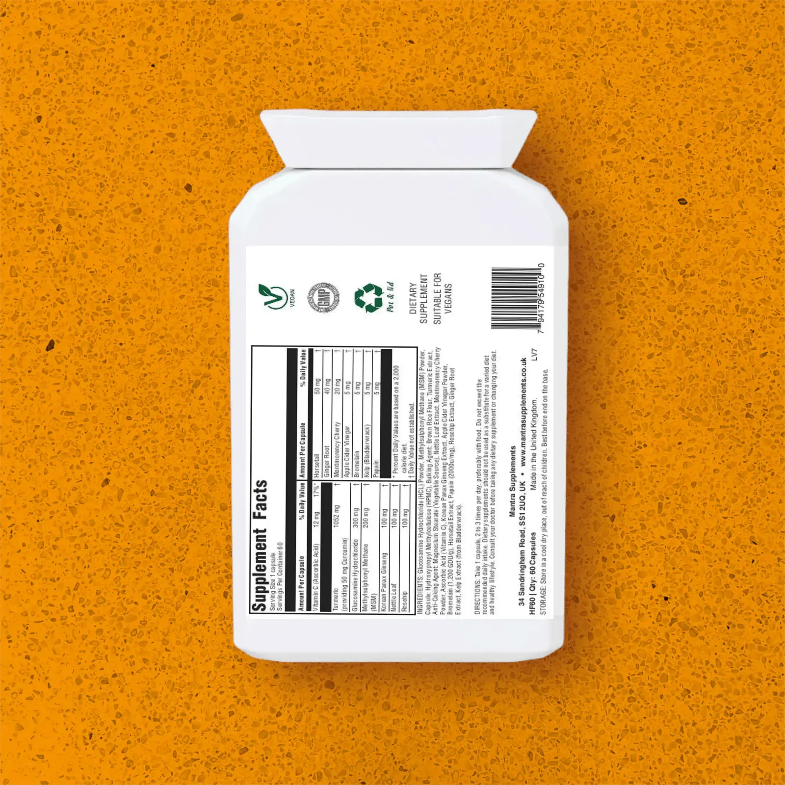 INGREDIENTS: Glucosamine Hydrochloride (HCl) Powder, Methylsulphonyl Methane (MSM) Powder, Capsule Shell: Hydroxypropyl Methylcellulose (HPMC), Brown Rice Flour (Oryza Sativa), Turmeric Root Extract (Curcuma Longa), Anti-Caking Agent: Magnesium Stearate (Magnesium salts of fatty acids) (vegetable source), Nettle Leaf Extract (Urtica dioica), Montmorency Cherry Powder (Prunus cerasus Montmorency), Vitamin C (as Ascorbic Acid), Korean Panax Ginseng Extract, Apple Cider Vinegar Powder (Malus Sylvestris), Bromelain (1,200 GDU/g), Horsetail Extract (Equisetum), Papain (2000u/mg), Rosehip Extract (Rosa Canina), Ginger Root Extract (Zingiber Officinale), Kelp Extract (from Bladderwrack).