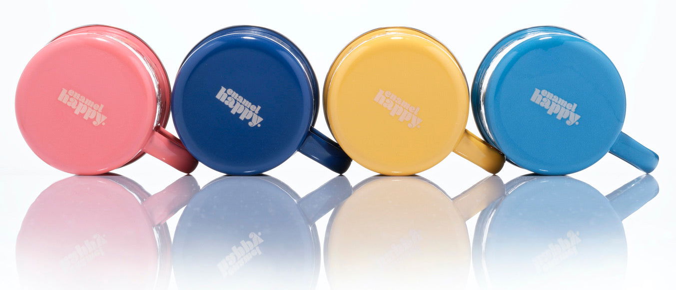A set of four enamel mugs in Rose pink, Honey Yellow, Ocean Teal Blue, Midnight navy in our beautiful colourful retro inspired design with a smart stainless steel rim.