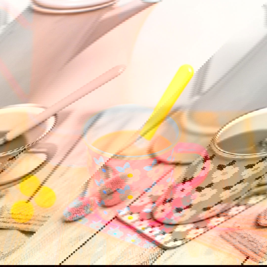 Each set contains a beautiful quality enamel mug in rose pink, honey yellow, ocean blue or midnight navy with matching traditional cork coaster.