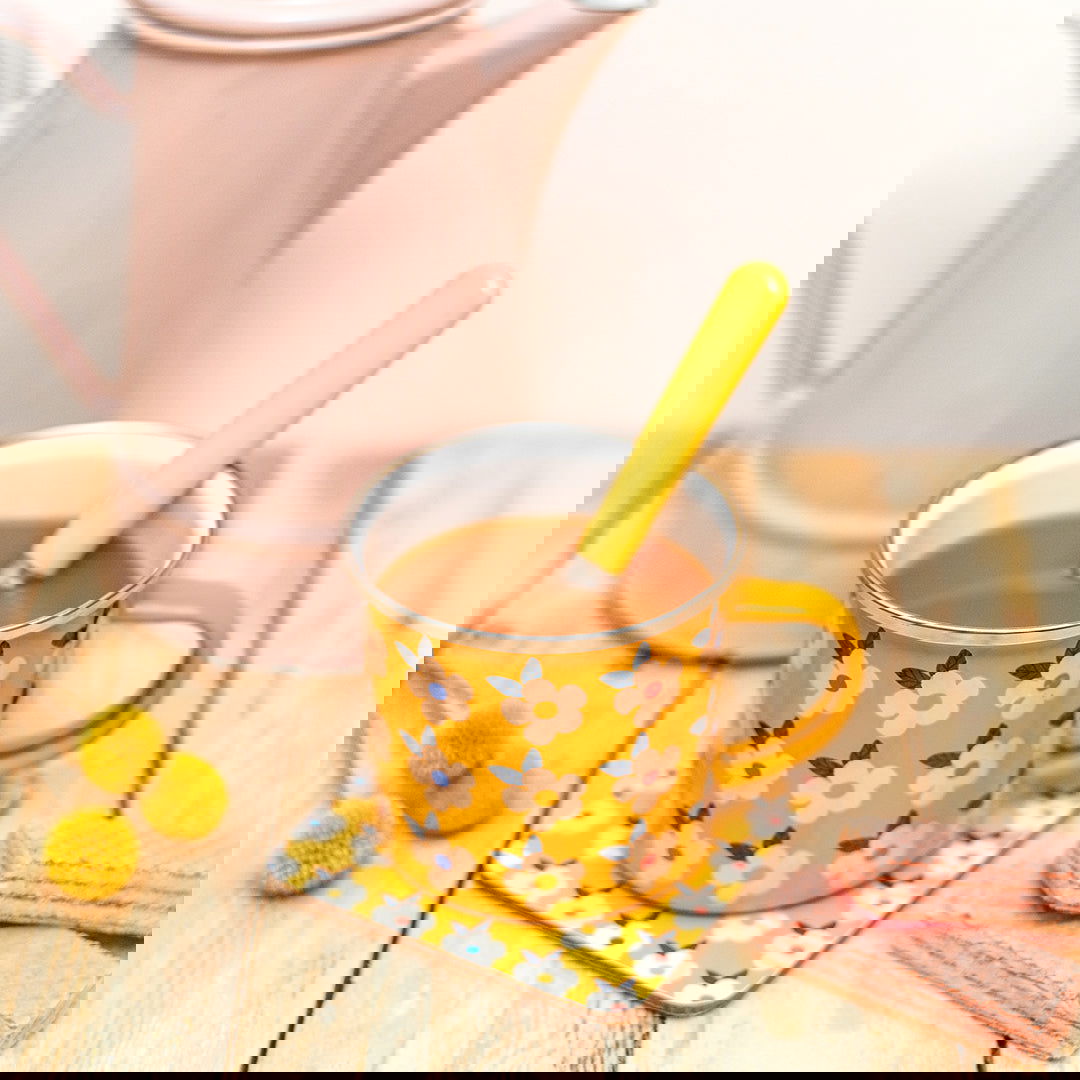 Each set contains a beautiful quality enamel mug in rose pink, honey yellow, ocean blue or midnight navy with matching traditional cork coaster.