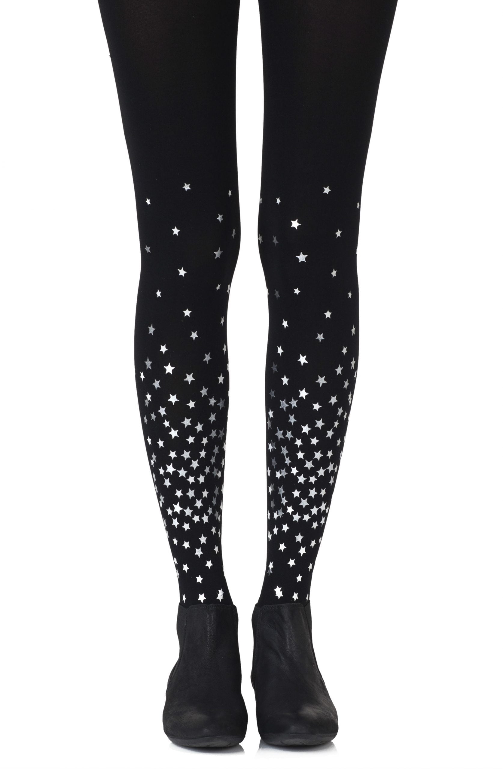 Stand out from the crowd with Rise and Shine tights that feature an allover star print. Colour: Black tights with Grey Silver print. Thickness: 120 denier. Your entire leg will be getting Zohara love with allover prints. Both sides are not created equal with allover tights so please look at the foot of the tights before wearing to ensure you don't step on the print. (The front print will be lower than the back.) No doubt you will shine with our metallic prints. Please note that these prints require extra care when washing and will naturally fade with wear. Unless they have X-ray vision no one will be able to see through these opaque tights. Hand print no two are the same.