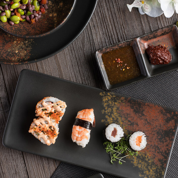The Oxy Coupe Plate boasts a robust vitrified porcelain construction, ensuring both strength and durability. Its dark satin glaze and fiery hand-decorated accents add a touch of drama to any serving. The collection also offers versatile options such as platters and accessories, all hand-finished for a unique touch.