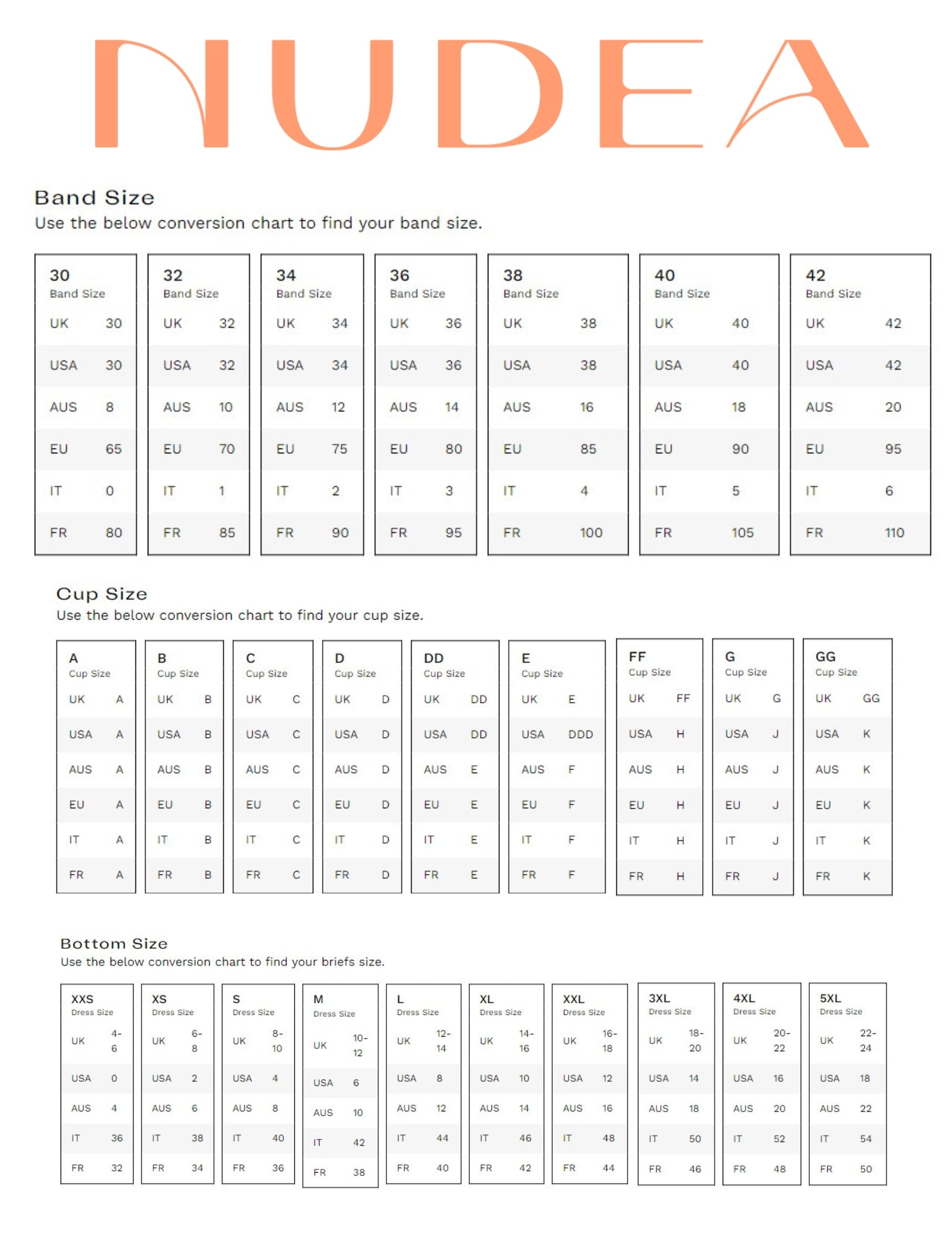 | Size | US | UK | EU | AU | China | Japan | Bust (in/cm) | Waist (in/cm) | Hips (in/cm) |