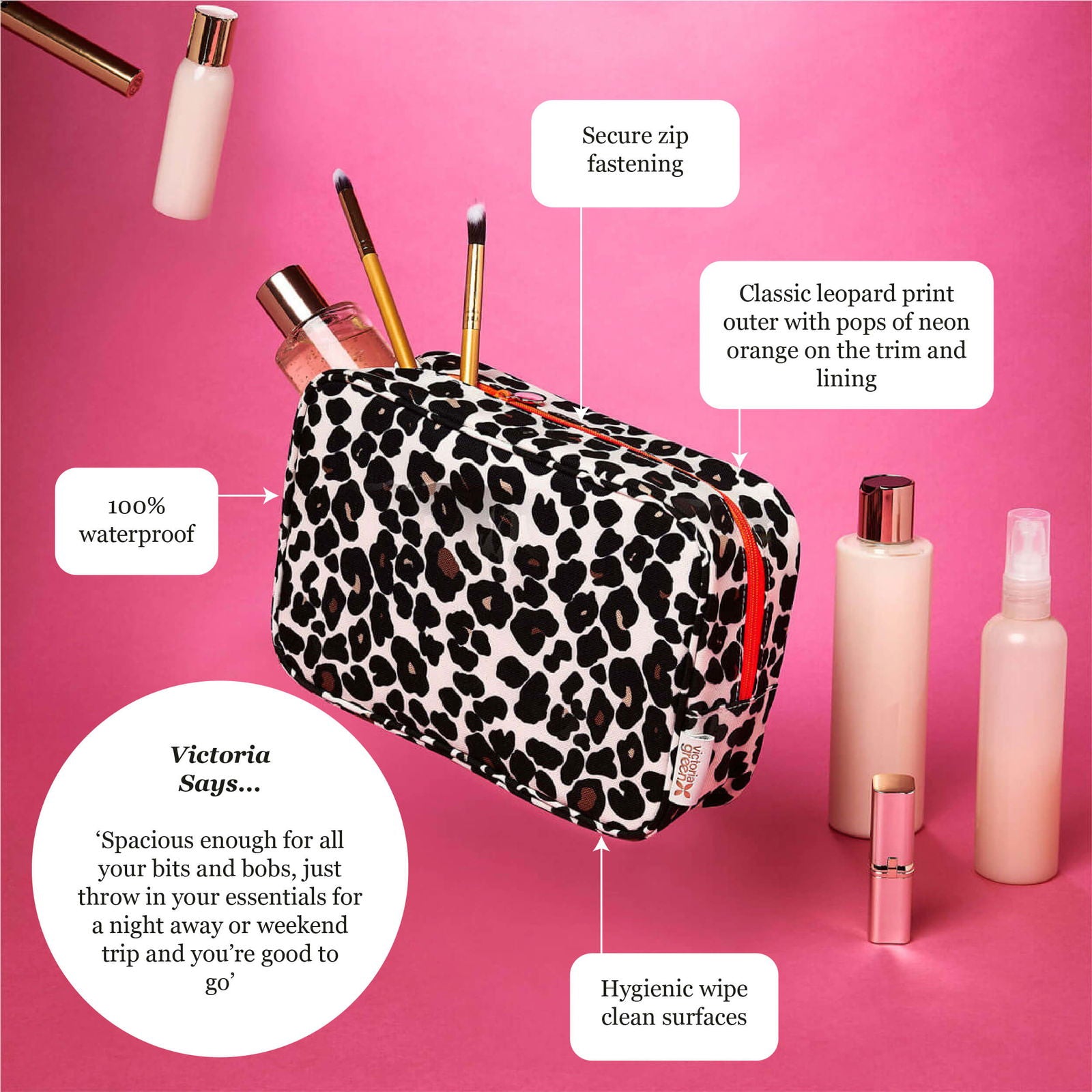 A ladies wash bag which is lightweight and strong and set to become an indispensable part of your beauty collection. Featuring our bold leopard tan print pattern together with a bright orange lining, this practical beauty kit case has a contrasting neon orange zip fastening and a branded gold zip pull. Perfectly sized to use as a large makeup bag or a compact wash bag.