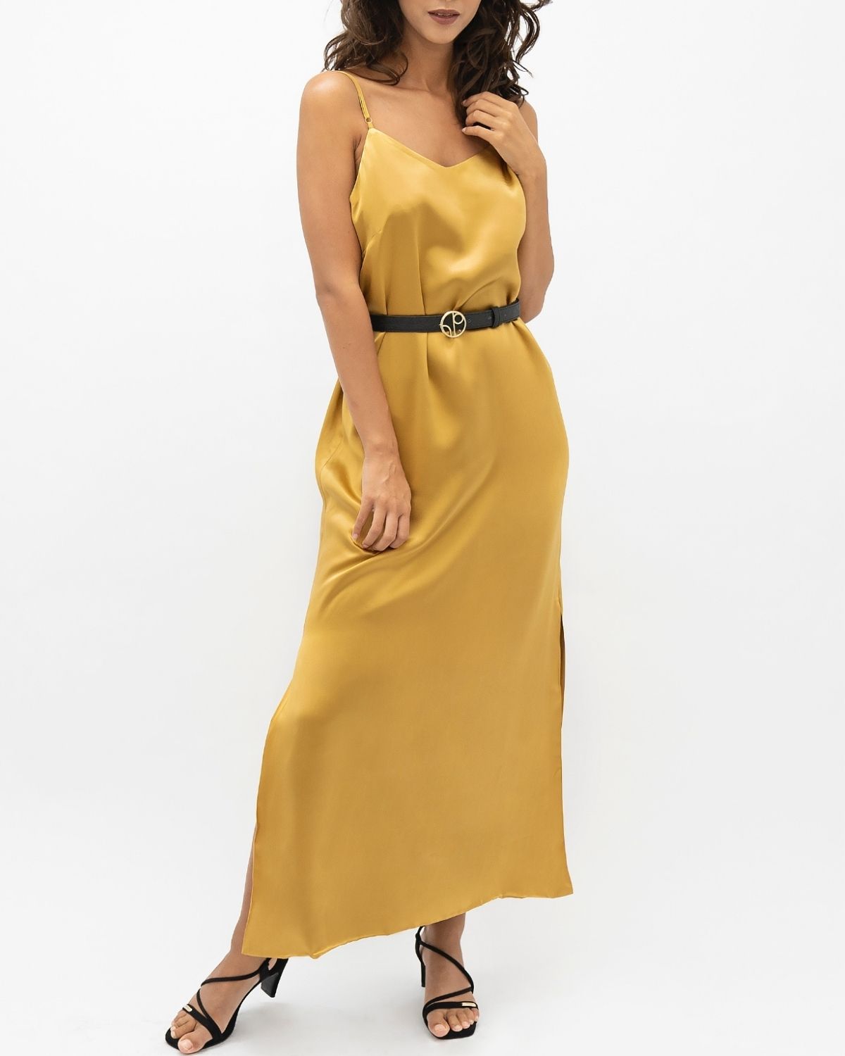 - Slip-on camisole maxi slip dress - Clean finish V-neckline - Slit on both sides - Straight fit - Brass ring and slider on the adjustable thin straps - 1 People brass logo at back - Made in Solo, Indonesia - bluesign® certified silk & dyeing - The dress length is 123 cm in size M (as reference for remaining sizes)