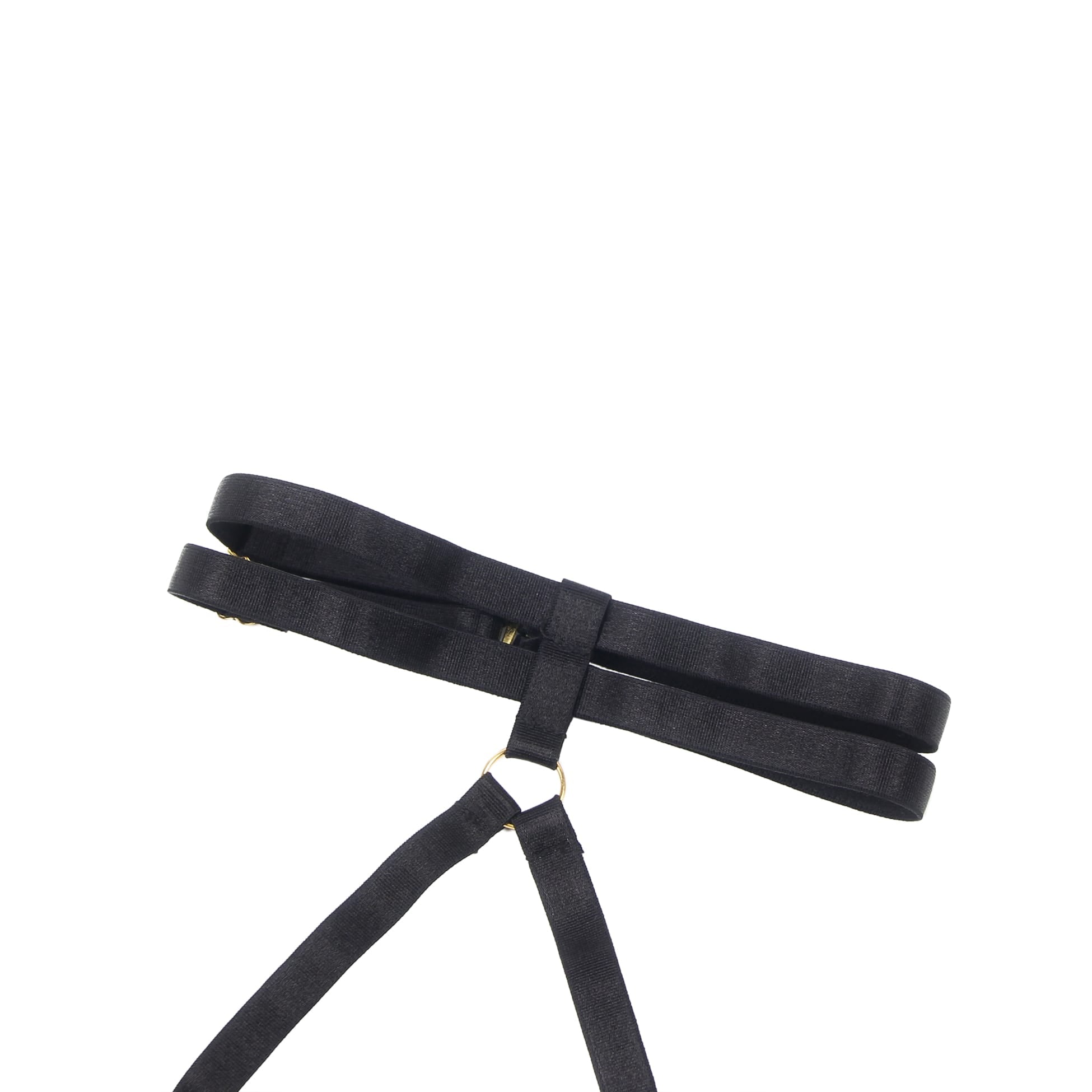 Indulge in bold elegance with this luxurious black bra and thong set, featuring a soft, velvety feel that adds a touch of sophistication. The structured bra is designed with daring cut-outs, adding a hint of intrigue, while delicate gold hardware details bring a glamorous finish. Complete with a halter-style choker neckline and adjustable straps, this set offers a customised fit that perfectly highlights your curves. The matching high-cut thong is finished with gold accents for a polished look. Ideal for those moments when you want to feel both seductive and effortlessly stylish!
