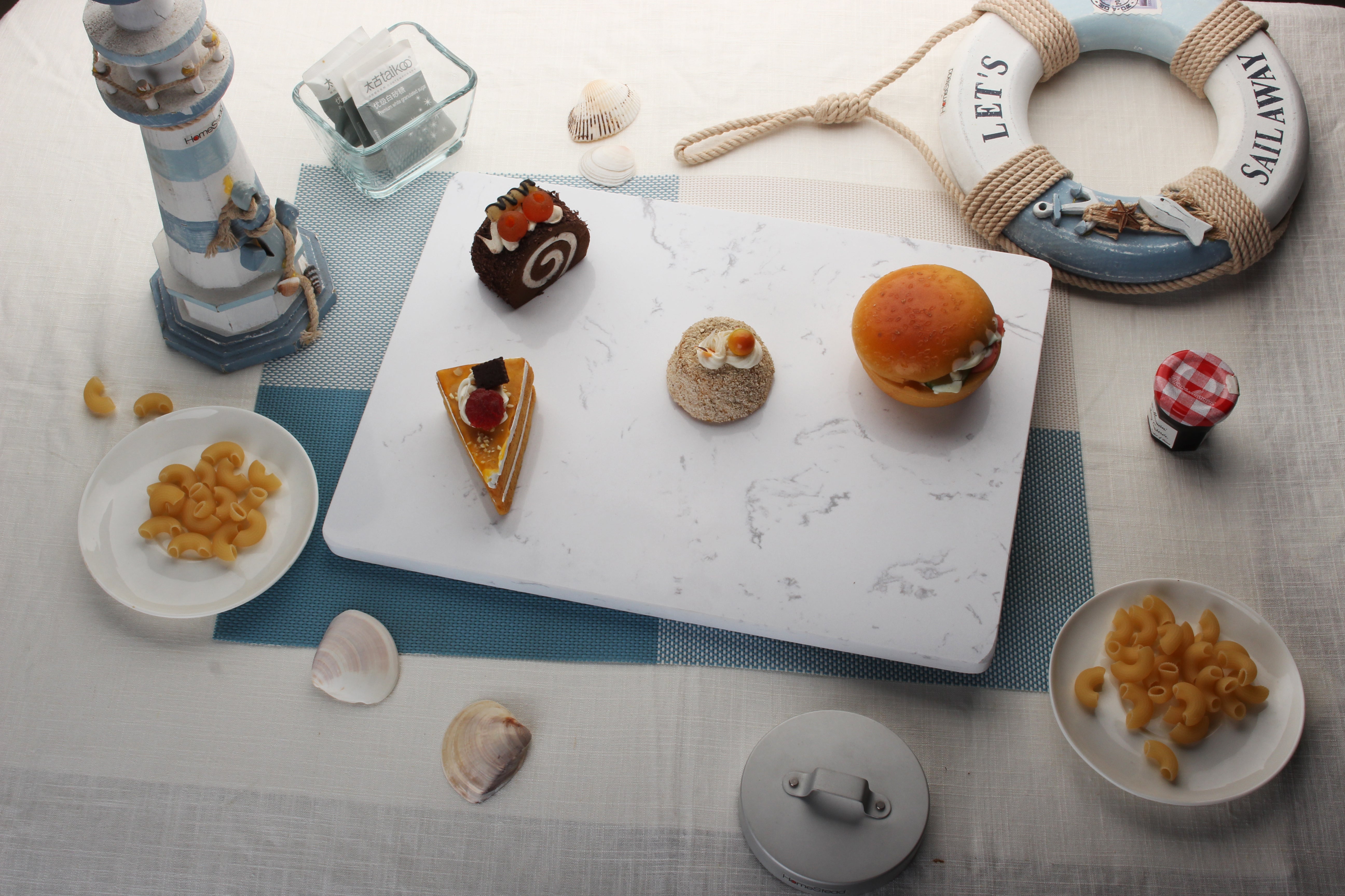 • Rectangular white marble kitchen work top, placemat, chopping board