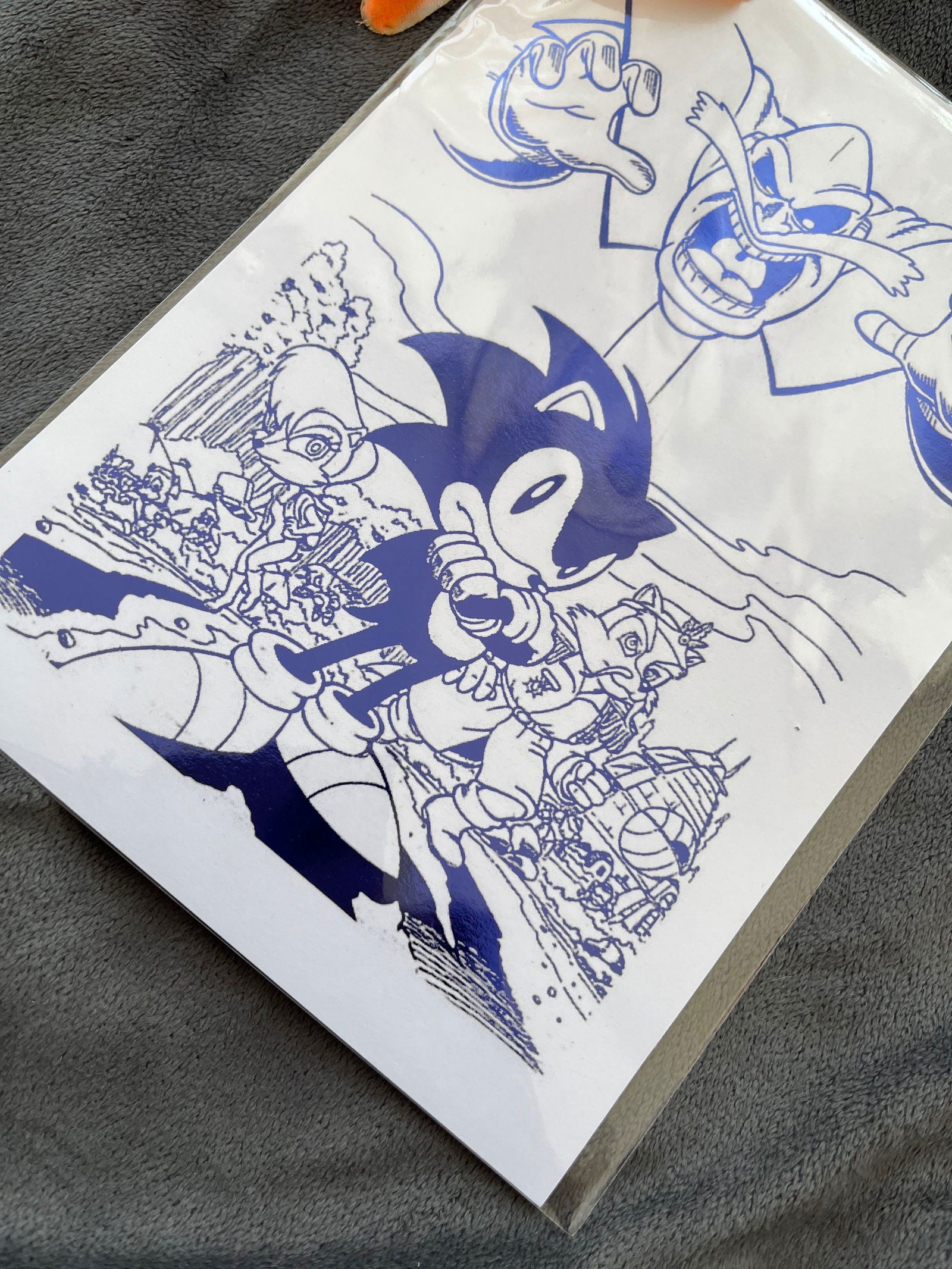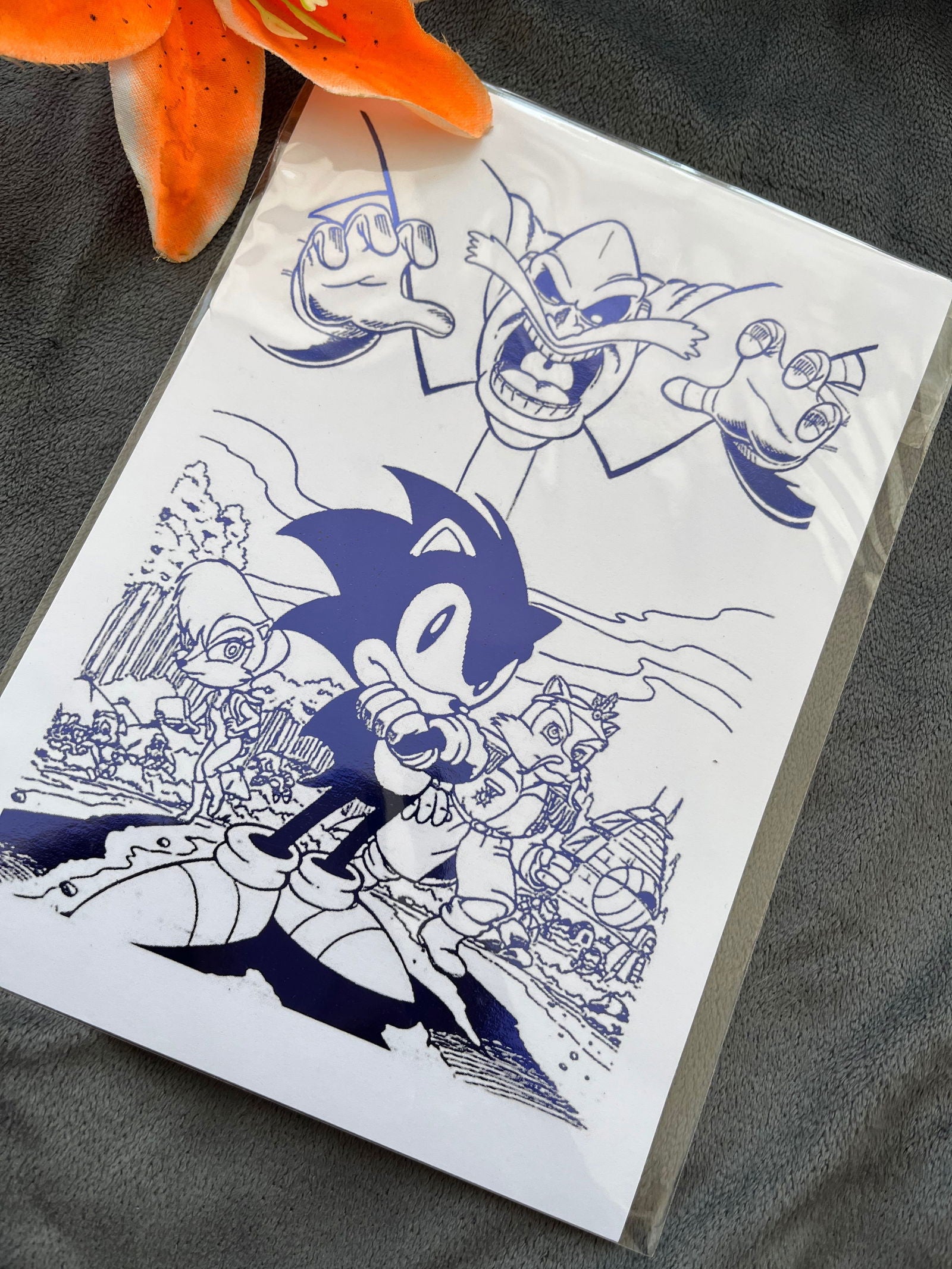 This exclusive print features the beloved blue hedgehog, beautifully rendered in shimmering blue foil accents, capturing the essence of his lightning-fast adventures.