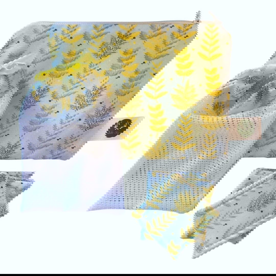 Our reusable pouch, makeup removal pads and washbag giftset is the perfect solution for the environmentally-conscious, simply use, wash and reuse with a convenient way to store and carry. The cute foliage pattern features across all three products, handmade right here in Wales.